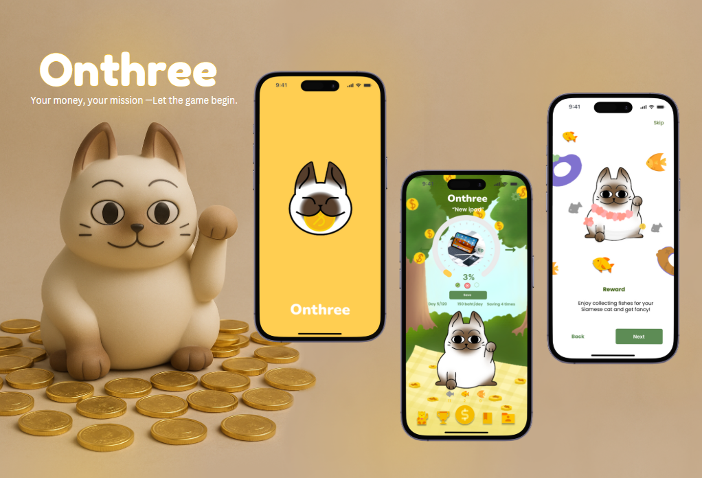Onthree เป็นแอปพลิเคชั่นเกมวางแผนการเงินสำหรับคนรุ่นใหม่ที่อายุประมาณ 16–25 ปี ในประเทศไทย แอปนี้ช่วยให้ผู้ใช้กำหนดเป้าหมายการใช้จ่ายและจัดการบริหารทางการเงิน พัฒนาพฤติกรรมการออมอย่างชาญฉลาด และสร้างแรงจูงใจผ่านความท้าทายและการมีส่วนร่วมในเกมที่สนุกสนาน อีกทั้งผู้เล่นยังสามารถติดตามความคืบหน้าเกี่ยวกับรายจ่ายด้วยแผนส่วนบุคคลที่สามารถออกแบบได้เอง ทำให้การจัดการเงินเป็นเรื่องที่มีประโยชน์และไม่น่าเบื่ออีกต่อไป