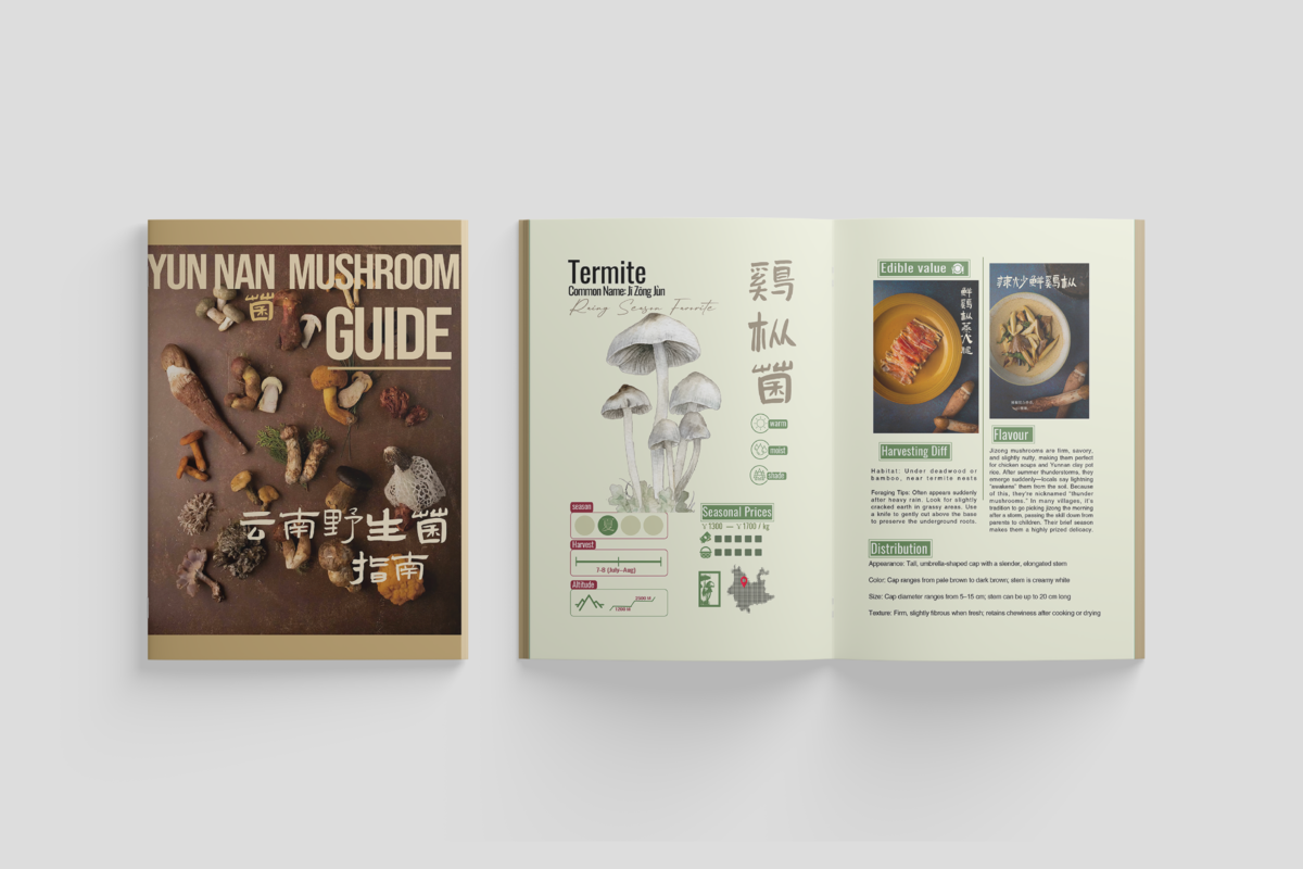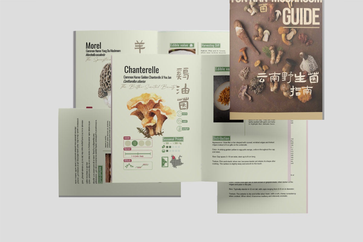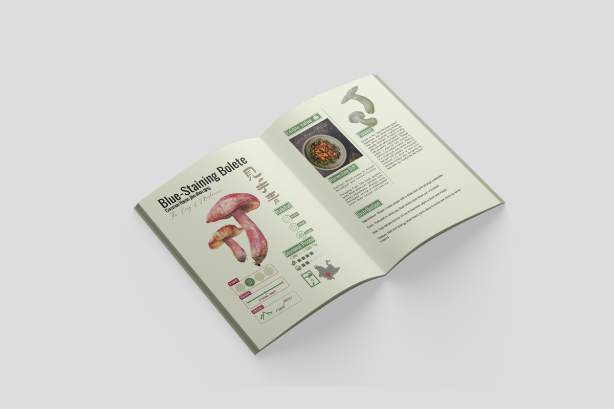คู่มือเห็ดป่ายูนนาน เป็นคู่มือนำเที่ยวเชิงภาพประกอบ ที่ออกแบบมาสำหรับนักท่องเที่ยวต่างชาติอายุ 20–25 ปี โดยจะแนะนำเห็ดป่าที่กินได้ และแบบมีพิษในเมืองยูนนาน โปรเจกต์นี้จะรวบรวมภาพประกอบเพื่อการศึกษา คำแนะนำด้านความปลอดภัย และคำแนะนำเส้นทางการเก็บเห็ดต่างๆ เพื่อช่วยเพิ่มความตระหนักรู้เกี่ยวกับเห็ด วัฒนธรรมอาหาร และการท่องเที่ยวเชิงนิเวศ